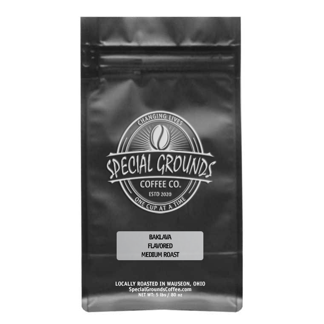 This Baklava-flavored coffee mimics the rich, sweet dessert with flaky layers of phyllo dough, a filling of chopped pistachios, and a sweet syrup flavored with cinnamon and cloves.